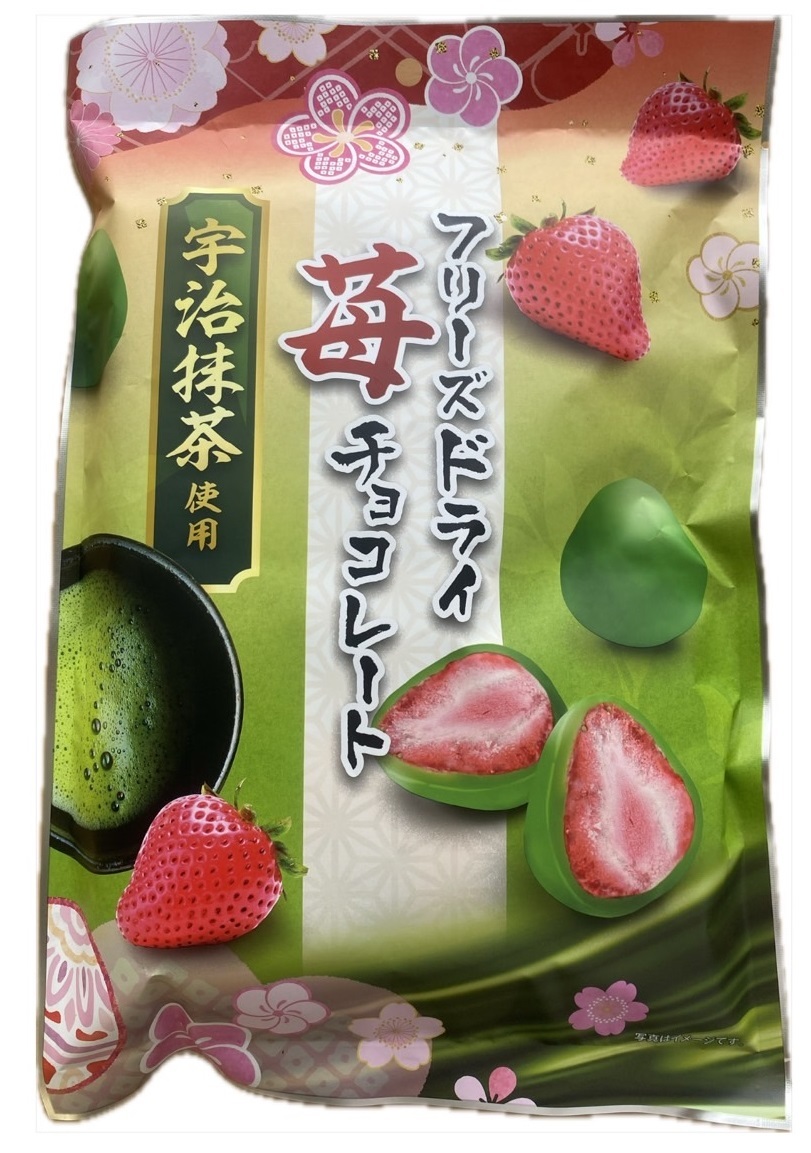 抹茶草莓巧克力將新鮮草莓使用冷凍乾燥技術,製造出眾人讚不絕口的口感,外層再搭配甜度適當的白巧克力,最後撒上優質的抹茶粉,變成口味絕佳的抹茶草莓巧克力。
