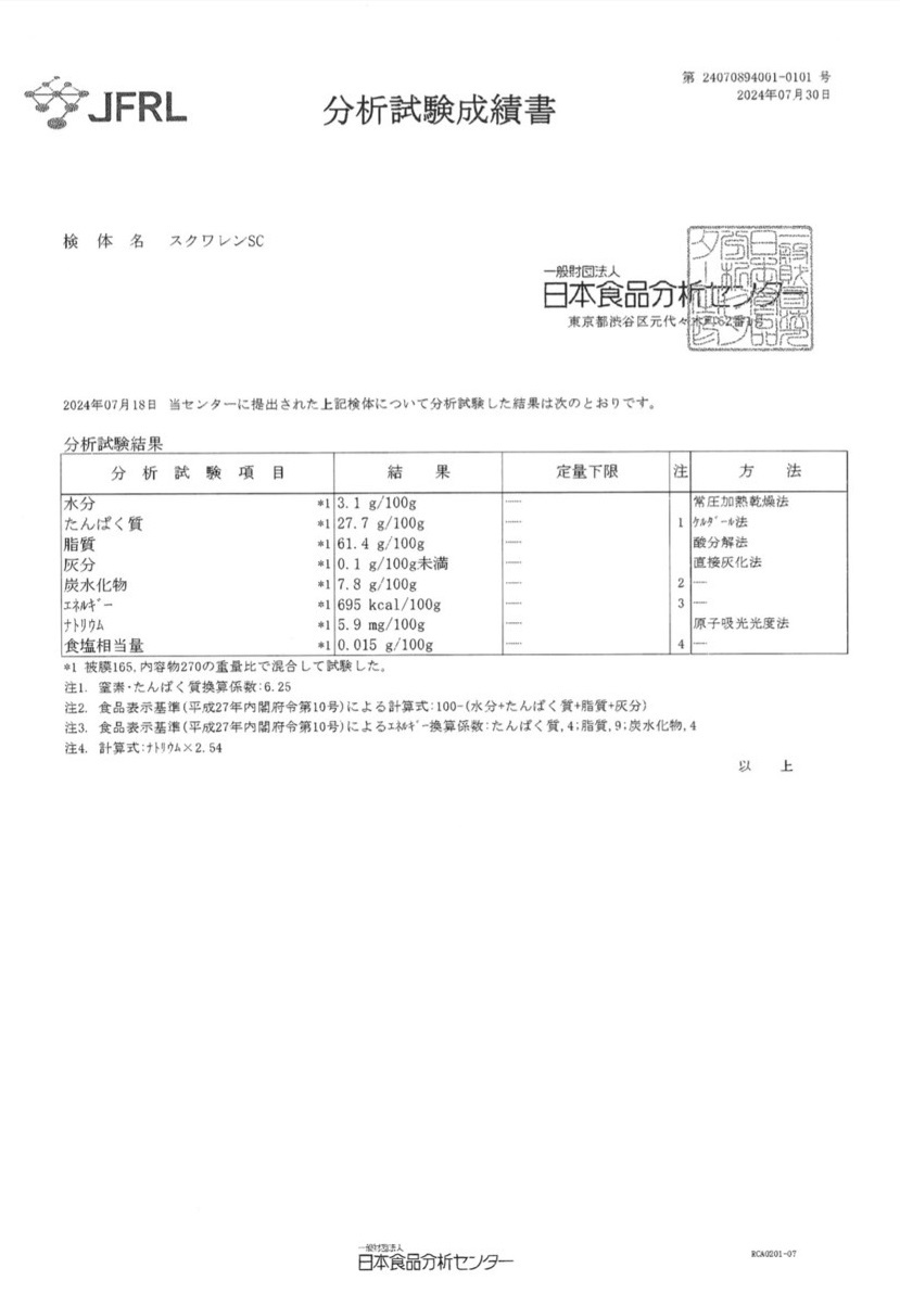 本產品名為“JAPAN SUPER Deep Sea Shark Squalene 100”,是一種易於使用的含角鯊烯的軟膠囊加工食品,僅使用從維持健康所必需的成分深海鯊魚肝油中獲得的純度為 99% 或以上的精製角鯊烯。