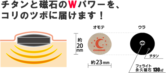 チタン磁気絆「痛痛貼り」は、フェライト永久磁石が筋肉組織の血行を改善して緊張をとき、コリをほぐします。