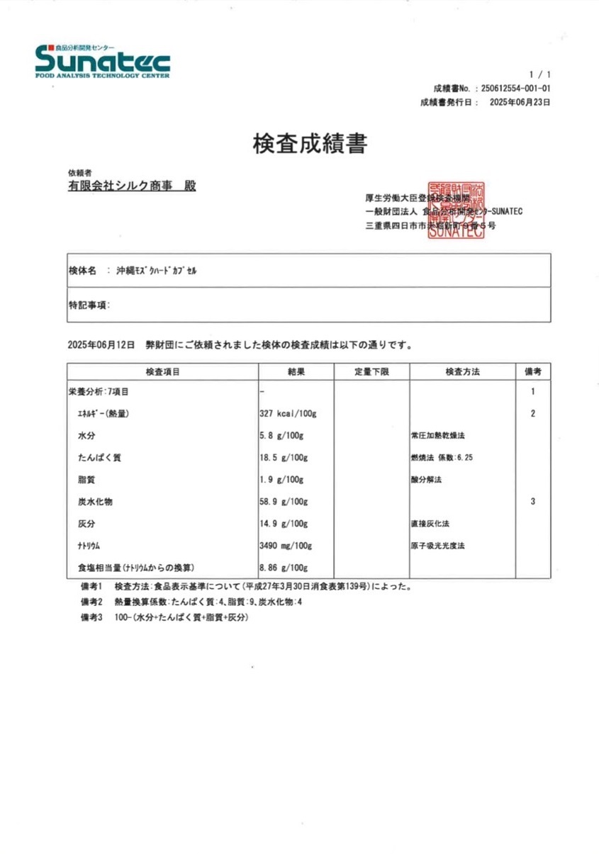 ※ SUNATEC ialah institusi pemeriksaan makanan dan ubat-ubatan yang diiktiraf oleh Menteri Pertanian, Perhutanan dan Perikanan Jepun dan didaftarkan di bawah Akta Sanitasi Makanan oleh Kementerian Kesihatan, Buruh dan Kebajikan Jepun.